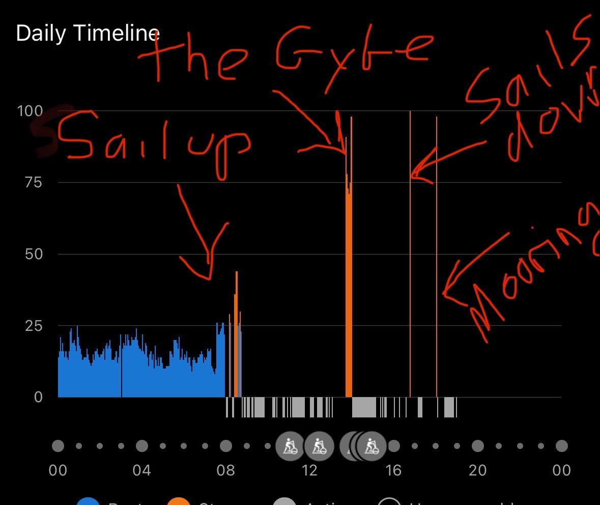 Despite shaking like a leaf and my knuckles turning white on the wheel through stress, the gybe was as gentle as a lamb. David looked at his garmin watch and it told him he’d done enough intense minutes for the whole week – and it’s only Monday!