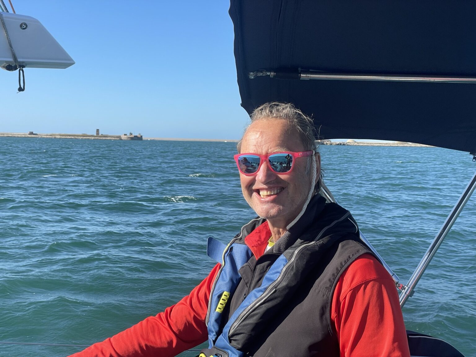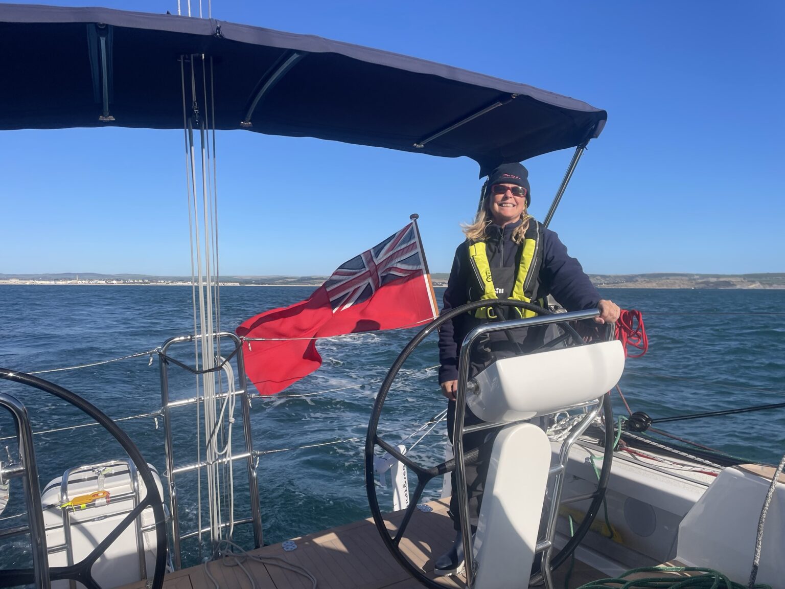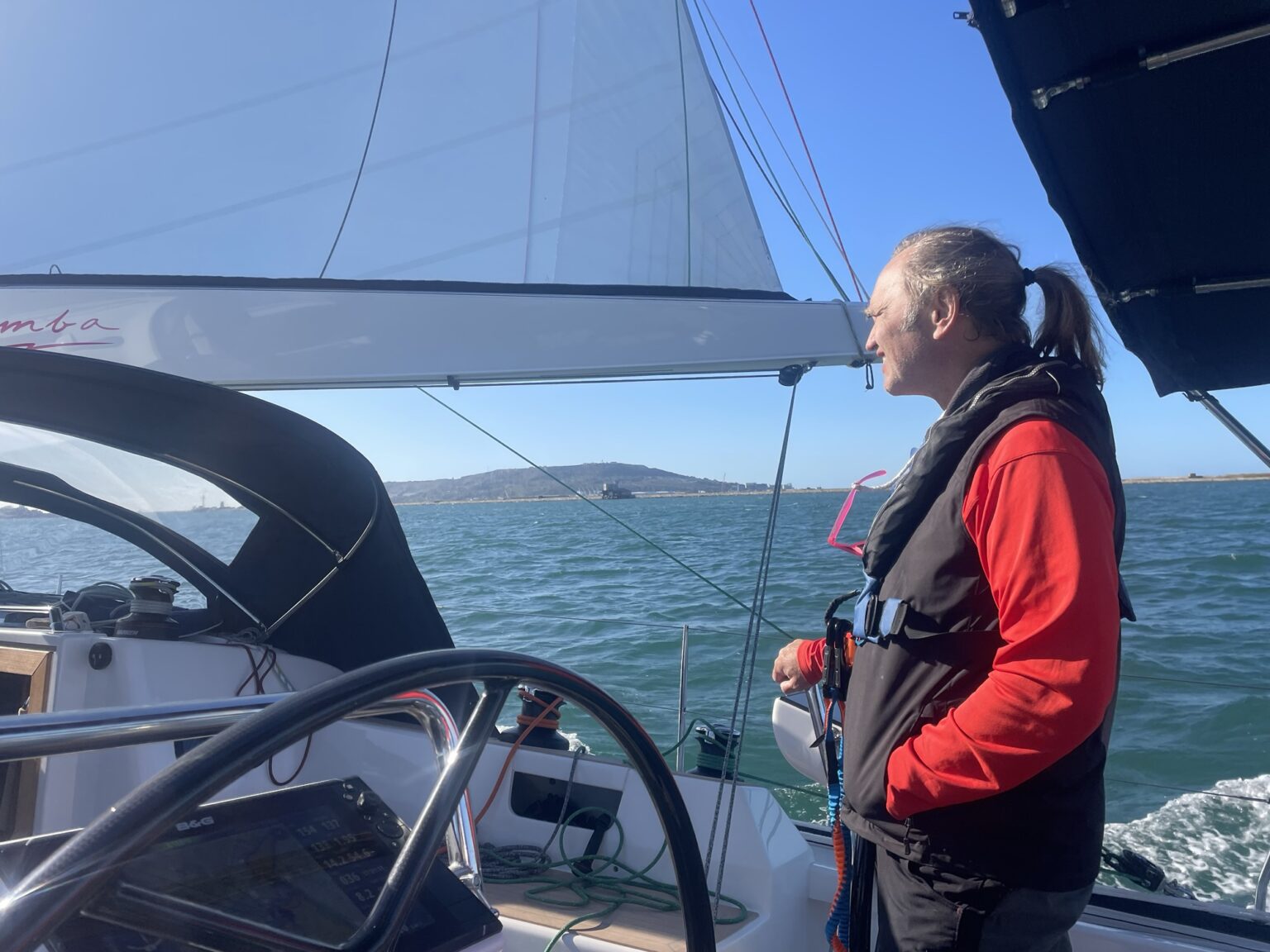 Knowing this we headed straight out well beyond the Bill by about 3 miles, but the water was very lumpy and confused. We were somewhat apprehensive about the gybe we have to do to turn West. There was up to 23 knots of wind and we were being tossed around like a cork on the mad sea so we reefed down in the hope of a smooth gybe.
