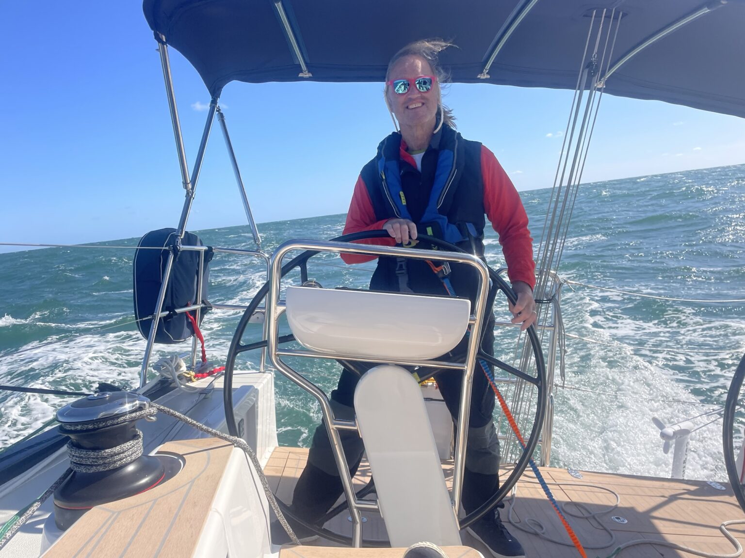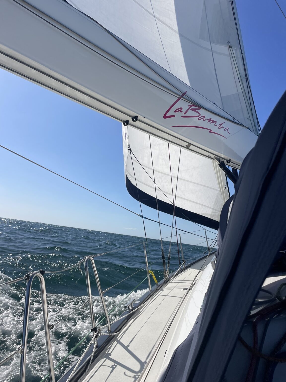 Last time we sailed in July we had Lily the Pink up and saw dolphins. This time we had more wind and were regularly hitting 10 knots with a reefed main and the Yankee. When you are two-handed and you’re going along nicely there is no need to push it!