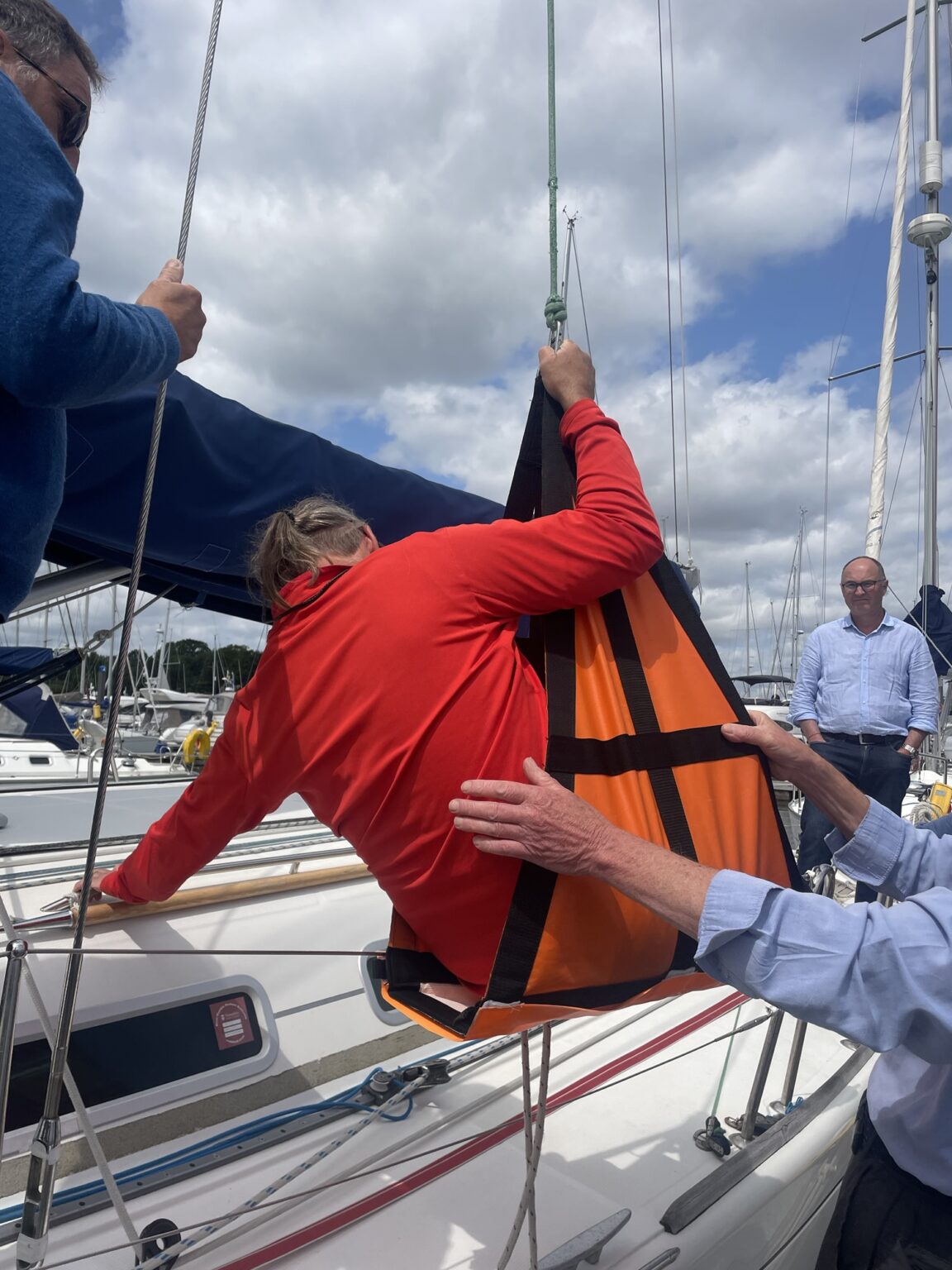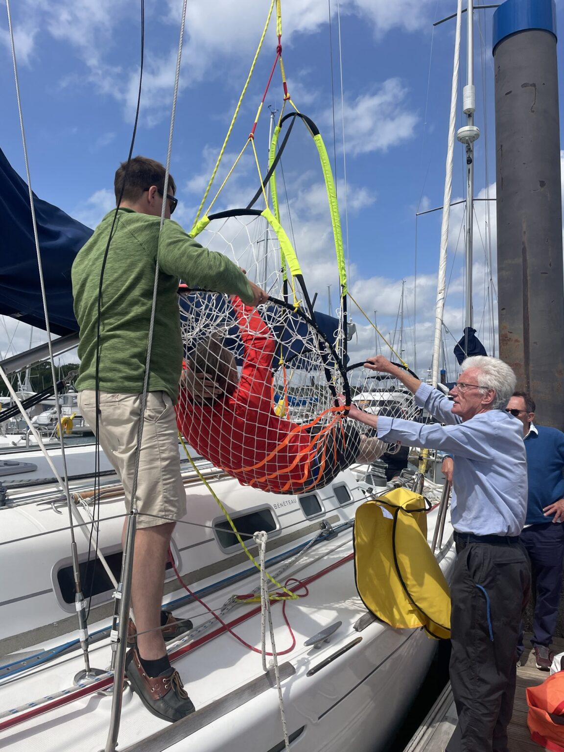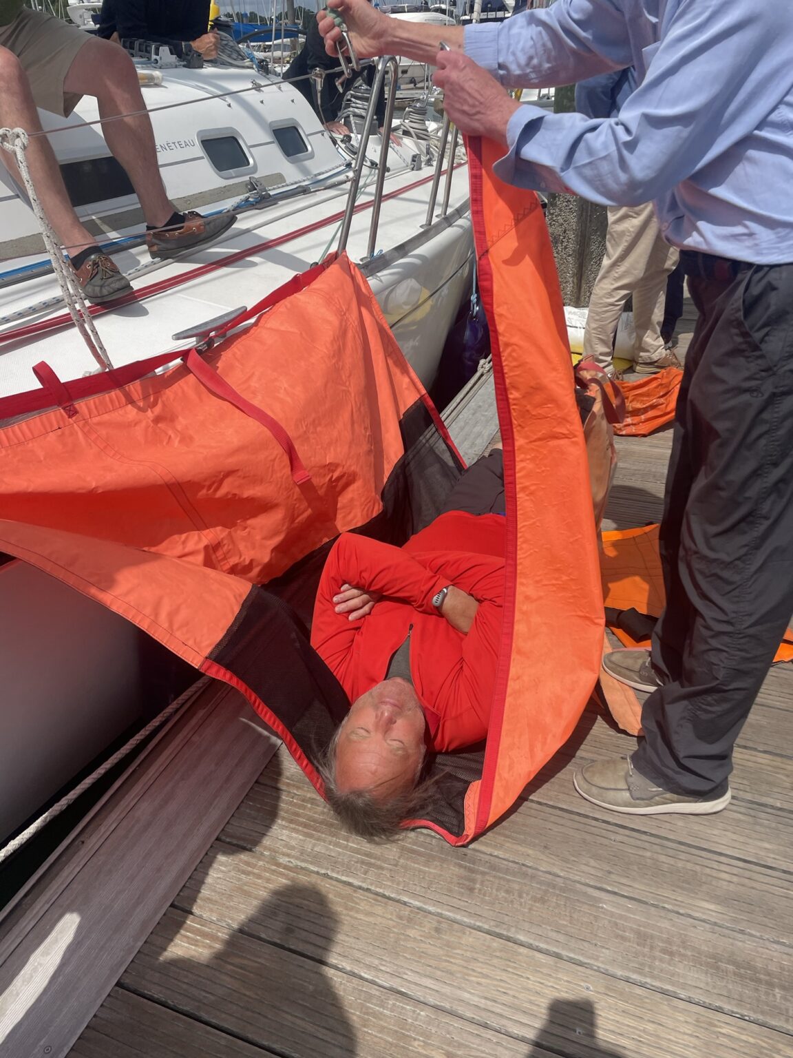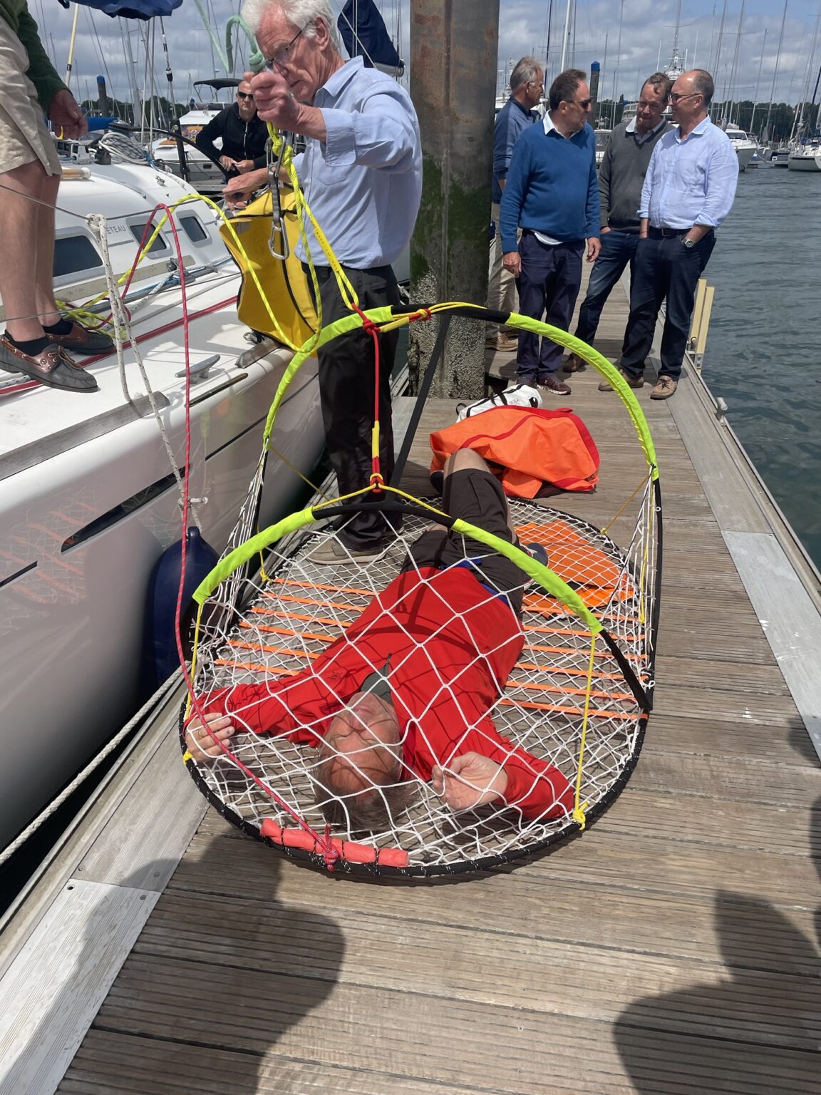 We went onto the dock and practiced collecting David in various contraptions & winching him aboard.