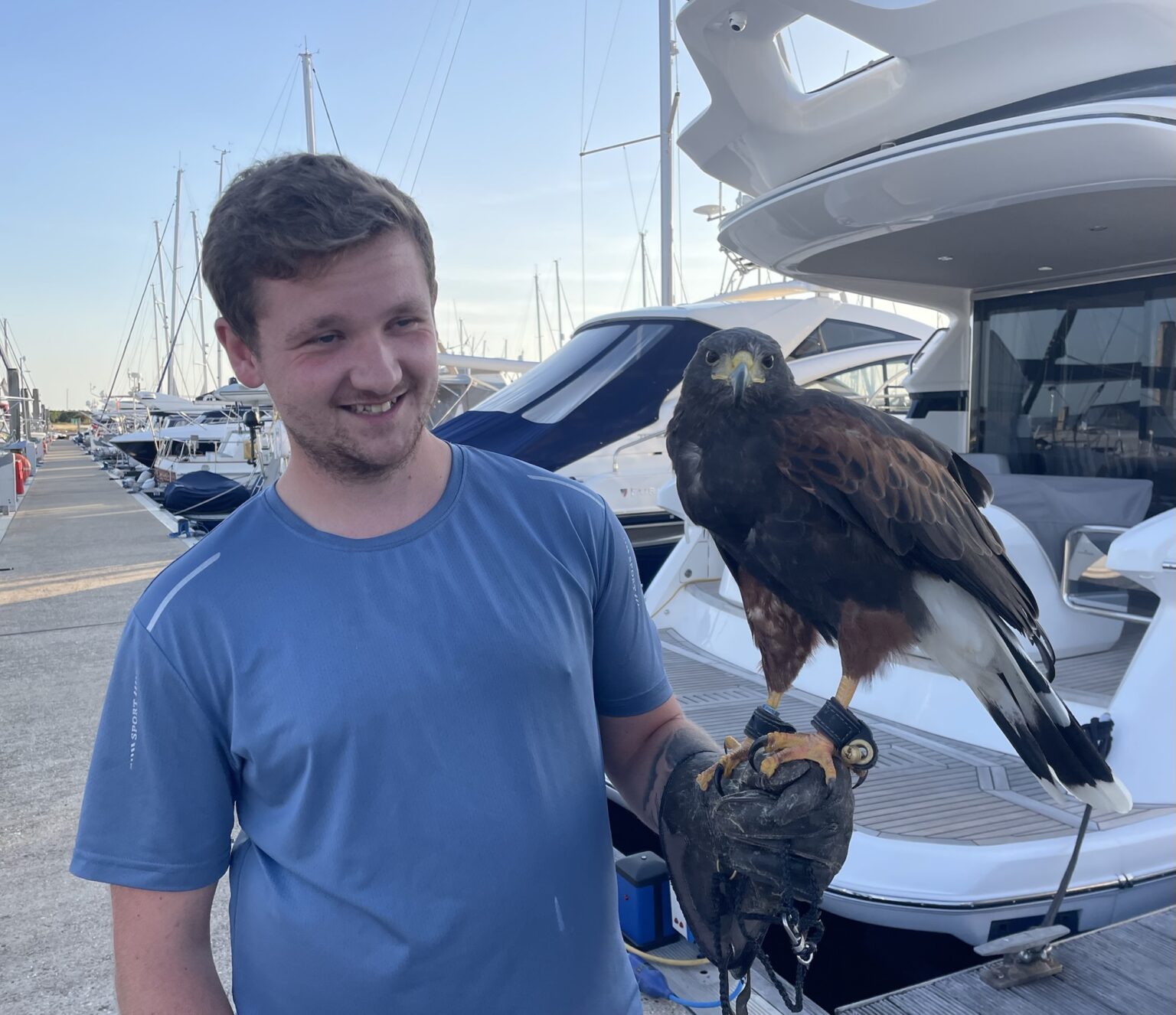 Later we met a falconer employed by the marina with his Harris hawk called Saturn. Her job is to scare away the starlings who like to perch on the masts and poo all over the decks. At this time of year the poo is blackberry colour which is very noticeable!