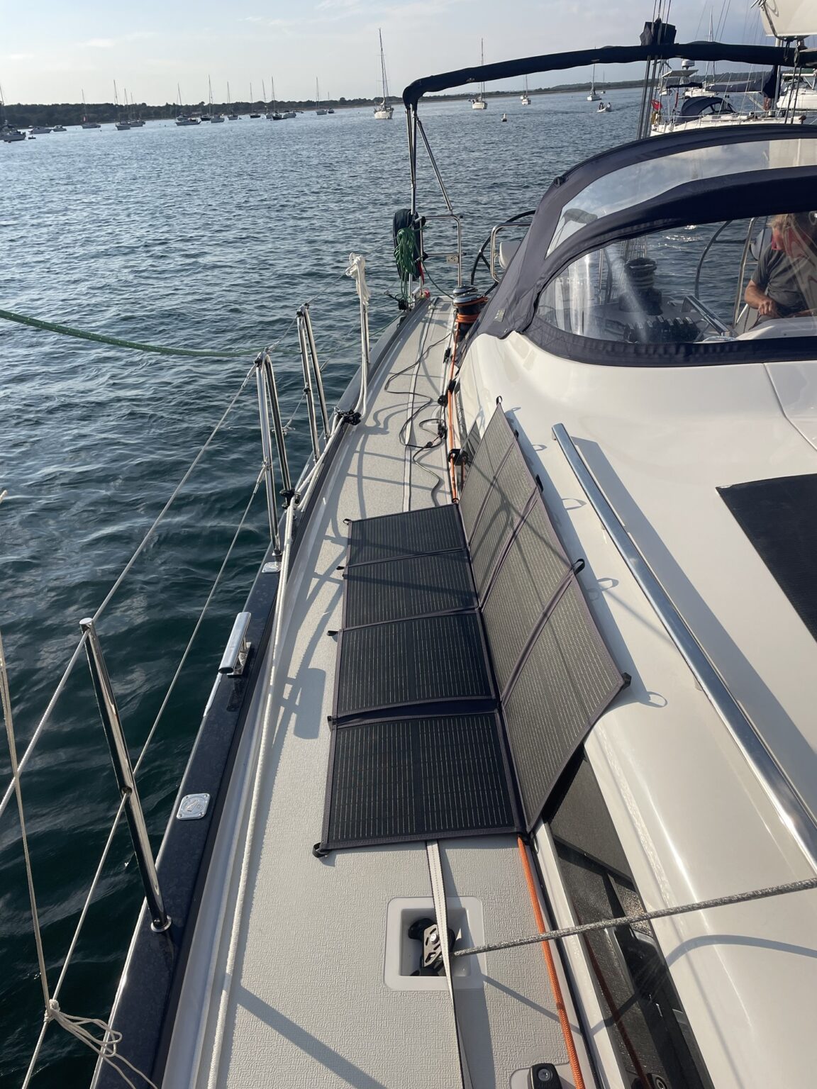 We tried out our new foldaway solar panels and in the afternoon sun they were giving 120W – we will get 2 more sets. David has been busy doing the electrical connections for them.